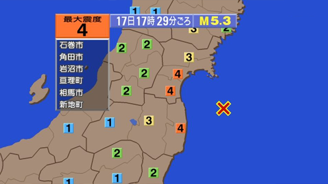 오늘(17일) 오후 5시 29분, 일본 후쿠시마(福島)현 앞바다에서 리히터 규모 5.3으로 추정되는 지진이 발생...